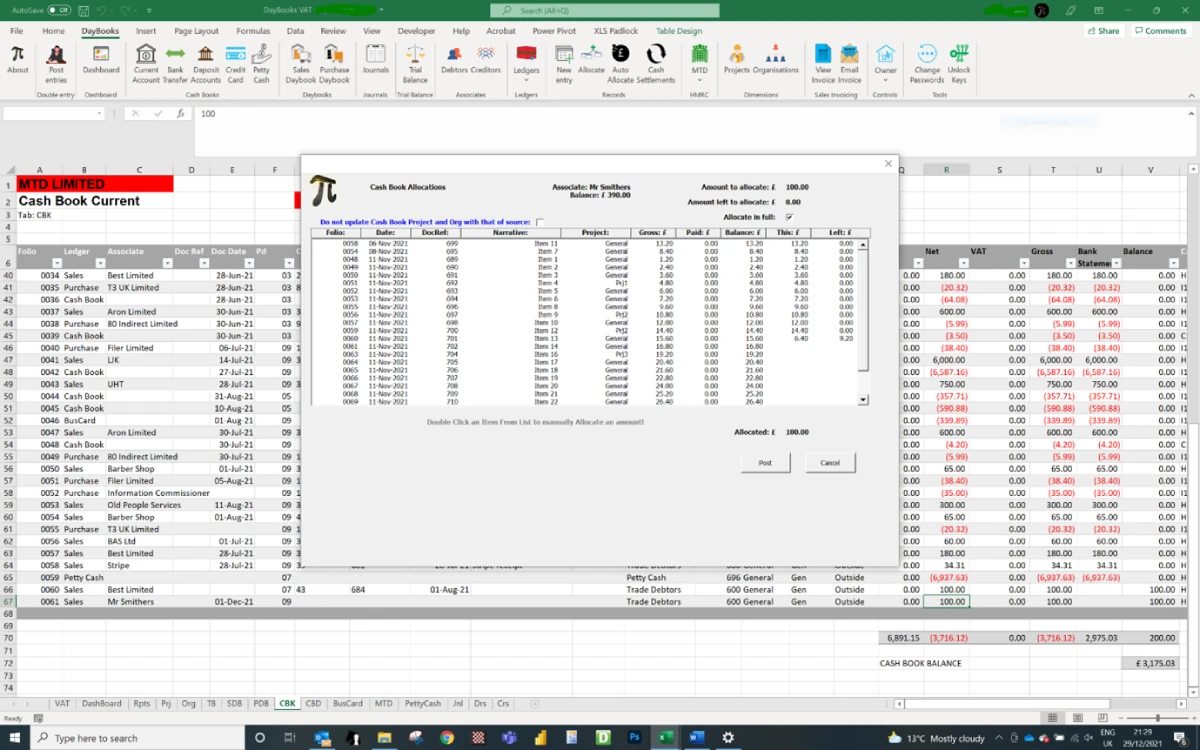 You may then allocate the cash book item to any of the outstanding invoices or even use the “Allocate in full” checkbox which will allocate the amount in full to all outstanding invoices arranged in date order. By default, the original cash book entry will be updated to match the project and org codes used on the allocated invoices. This is useful if you need to maintain balanced ledgers by project and organisation combinations. You may override this if deemed not necessary.